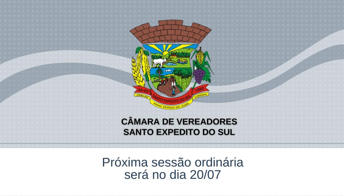 A Câmara Municipal de Vereadores de Santo Expedito do Sul comunica que a próxima sessão ordinária ocorre no próximo dia 20 de julho, às 19h. A sessão pode ser acompanhada ao vivo através da transmissão ao vivo nos canais oficiais da câmara municipal no Facebook e Instagram.