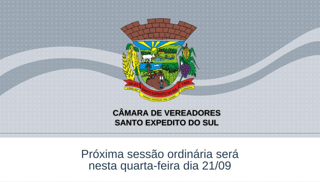 A Câmara Municipal de Vereadores de Santo Expedito do Sul comunica que a próxima sessão ordinária ocorre nesta quarta-feira, dia 21 de setembro, às 19h.
