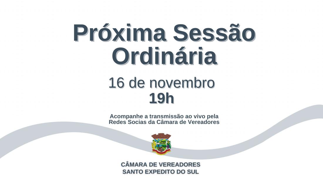 A Câmara Municipal de Vereadores de Santo Expedito do Sul comunica que a próxima sessão ordinária ocorre nesta próxima quarta-feira, dia 16 de novembro, às 19h.